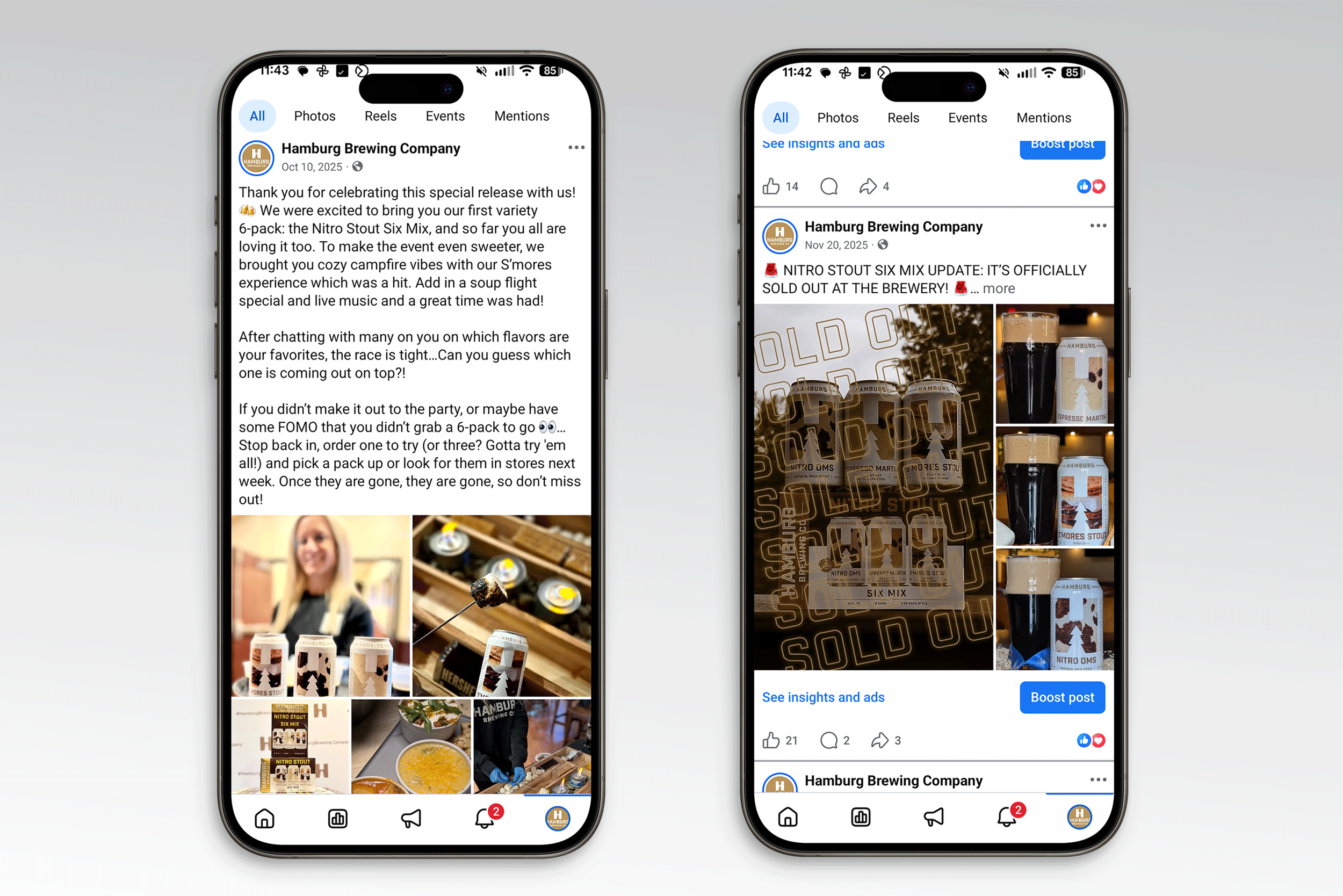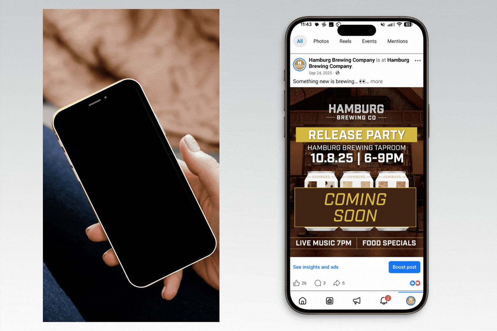 Created complete digital asset system for successful beer release: teaser Instagram/Facebook stories, save-the-date graphics, reveal Instagram Reel, email newsletter invite, website homepage hero, Facebook event page, and sold-out recap post. Built curiosity through sequential rollout while maintaining brand consistency across all platforms. Drove high engagement and sell-through at brewery release event.